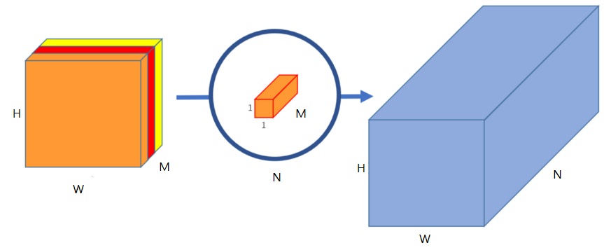 Fig.3 Pointwise convoultion은 채널간의 값을 합쳐주는 과정이라 볼 수 있다. 1x1xM의 커널이 N개 존재하고 각 커널은 같은 위치, 채널들간의 값을 하나로 합치는 연산을 한다. 그래서 H x W x 1 의 결과가 나오게된다. 이러한 커널이 N개 있으므로 Output은 H x W x N 의 shape를 가지게 된다. 마찬가지로 연산량을 계산해보면 (채널) x (Input 크기) x (output 채널)이 되고 아래와 같다.