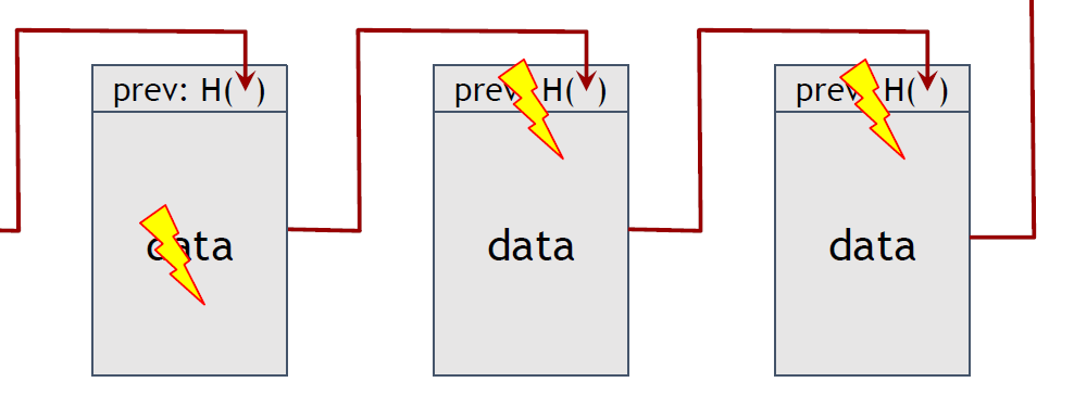 블록의 위조를 감지 할 수있다는 점을 자세히 보도록 하겠습니다. 오른쪽 이미지처럼 가장 왼쪽에 있는 블록의 데이터를 위조하면 어떻게 될까요?
