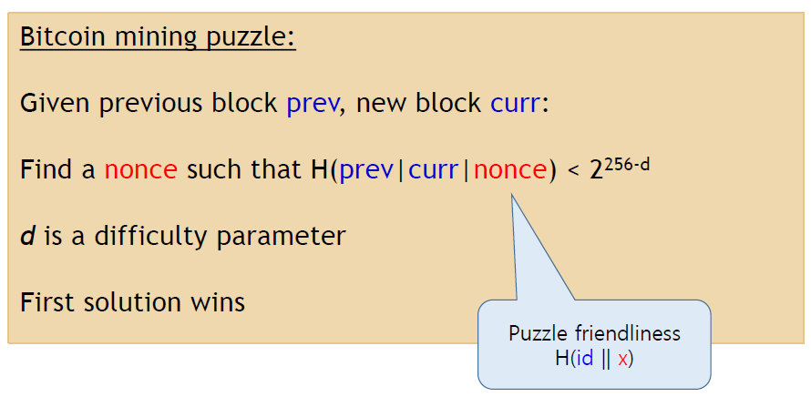 #1 https://down-develope.tistory.com/22 이전 포스팅에서 비트코인의 해시함수는 puzzle-friendly라고 했었습니다. puzzle-friendly는 'H(n|x) = y 라고 할 때, n과 y가 주어졌을때 x값을 찾기 아주 어려운것' 이라고 했었는데요, 말 그대로 퍼즐로 활용하기 적합한다는 의미입니다.