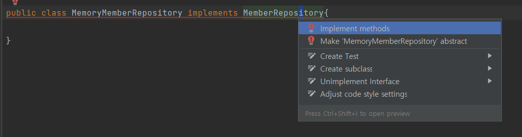 public interface MemberRepository { Member save(Member member); Optional<Member> findById(Long id); Optional<Member> findByName(String name); List<Member> findAll(); }그리고 같은 디렉토리에 구현클래스인 MemoryMemberReposiory 클래스를 생성하자! 그리고 implements로 인터페이스를 상속해주는데, 아래 사진처럼 alt + Enter를 눌려 아래 implement methods를 선택하면 한번에 추상메소드를 상속할 수 있다!