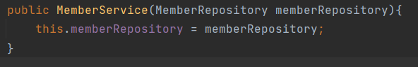그래서 아래처럼 생성자에서 레포 객체를 주입받게 하면 의존성이 없어진다. 이렇게 함으로서 MemberRepository 인터페이스를 상속하는 다른 클래스를 주고 싶을때 코드 수정없이 생성자로 전달하면 된다.