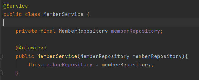 서비스도 마찬가지로 @Service 어노테이션으로 등록해주자. 전 포스팅에서 말했듯이 서비스같은경우 생성자에서 의존성을 주입받는다. 이때 레포지토리 객체를 자동으로 입력받기 위해 @Autowired 어노테이션을 사용해야한다.