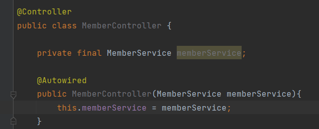이제 회원의 정보에 대한 레포지토리랑 서비스는 구현이 끝났으므로 컨트롤러를 구현해보자. 만들어둔 controller/ 패키지내에 MemberController.java 파일을 생성하자. 이제 Controller가 서비스를 이용하기 위해 서비스 객체가 필요할것이다. 그럼 이것을 Controller 클래스내에서 new 연산자로 새로 생성하여 사용하면 어떻게 될까? 그럼 다른 Controller가 이 맴버서비스를 가져다가 쓸때 서로간 맞지않는 문제가 생길것이다.